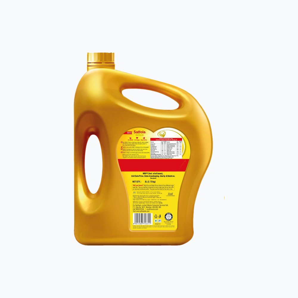 Saffola Gold is a blended edible oil, combining the benefits of rice bran and sunflower oil, designed to promote heart health. It features a balanced blend of MUFA and PUFA, providing a healthy balance of fats. Additionally, it utilizes LOSORB™ Technology, which reduces oil absorption during cooking, and is fortified with antioxidants and vitamins A and D.